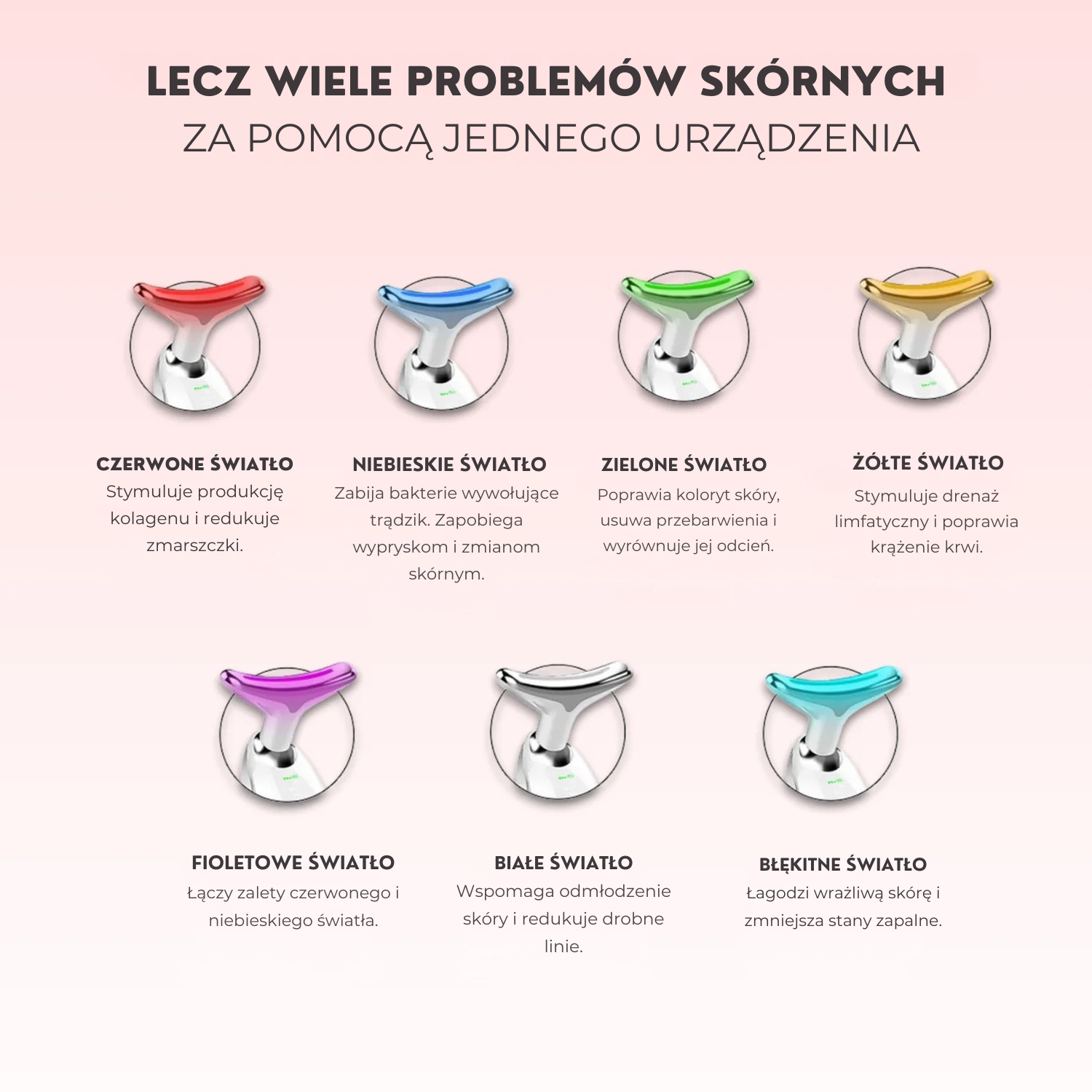 Tak, nasze urządzenie posiada wszystkie 7 kolorów: czerwone światło, niebieskie światło, zielone światło, cyjanowe światło, białe światło, fioletowe światło i żółte światło.