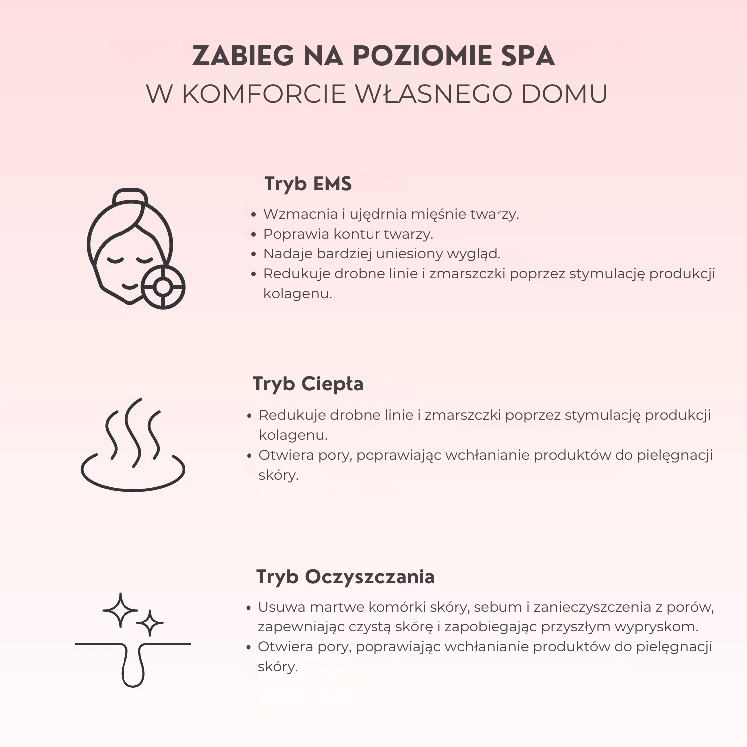 Łączy terapię czerwonym światłem (anti-aging), EMS (elektryczna stymulacja mięśni) dla widocznego liftingu i ujędrnienia, masaże wibracyjne redukujące opuchliznę oraz terapię ciepłem wspierającą krążenie i relaks.