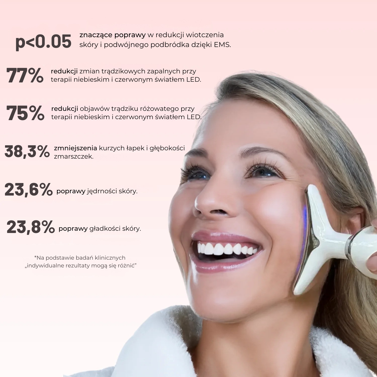 Na podstawie niezależnego badania walidacyjnego przeprowadzonego na 60 osobach w ciągu 30 dni z wykorzystaniem urządzenia GlowLane 7w1 LED. Wyniki mogą się różnić.
